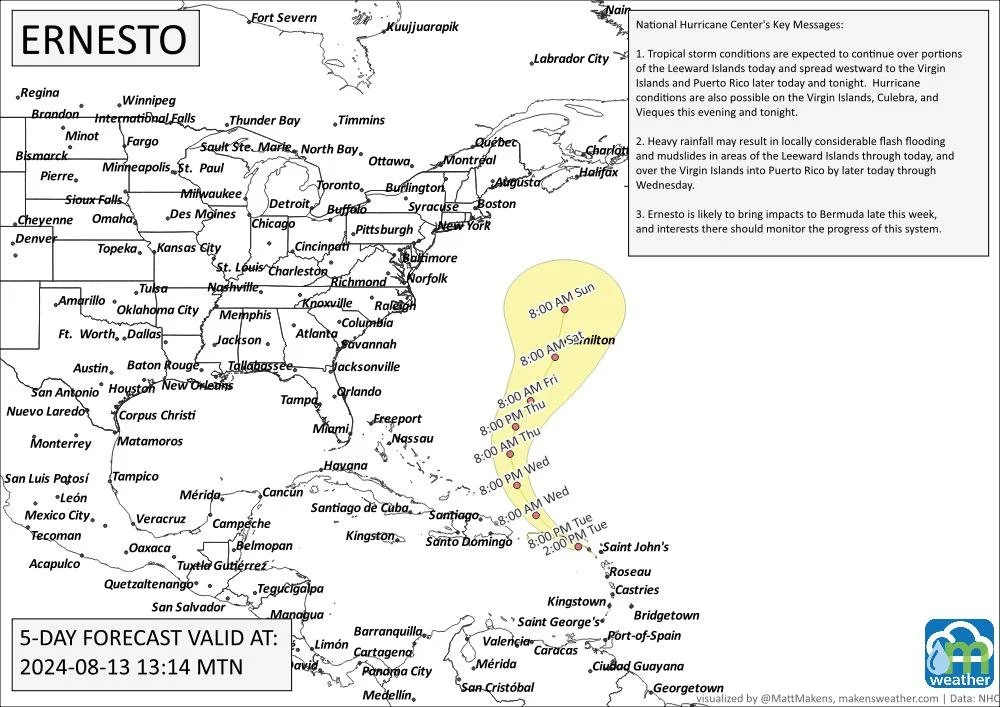 Ernesto is impacting some of the islands, and is expected to stay east of the mainland.