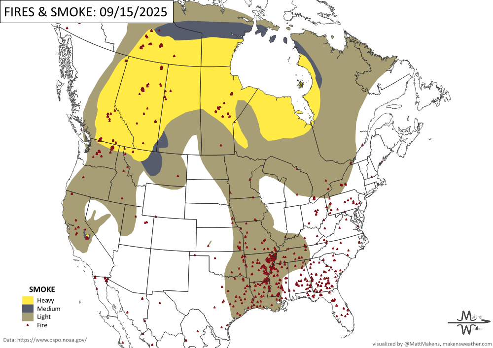 The U.S. weather pattern is shifting into a classic early fall setup. A nor’easter-like coastal storm is spinning up off the Southeast, set to hit the Mid-Atlantic coast midweek with rain, wind, and rough surf. At the same time, stubborn late-summer heat grips the Mississippi Valley and Northeast, while storm chances reload across the Central and Northern Plains. A soggy pattern also lingers over California, South Florida, and the Southwest into the weekend. Meanwhile, fog and air quality issues continue across British Columbia, Alberta, and Saskatchewan.