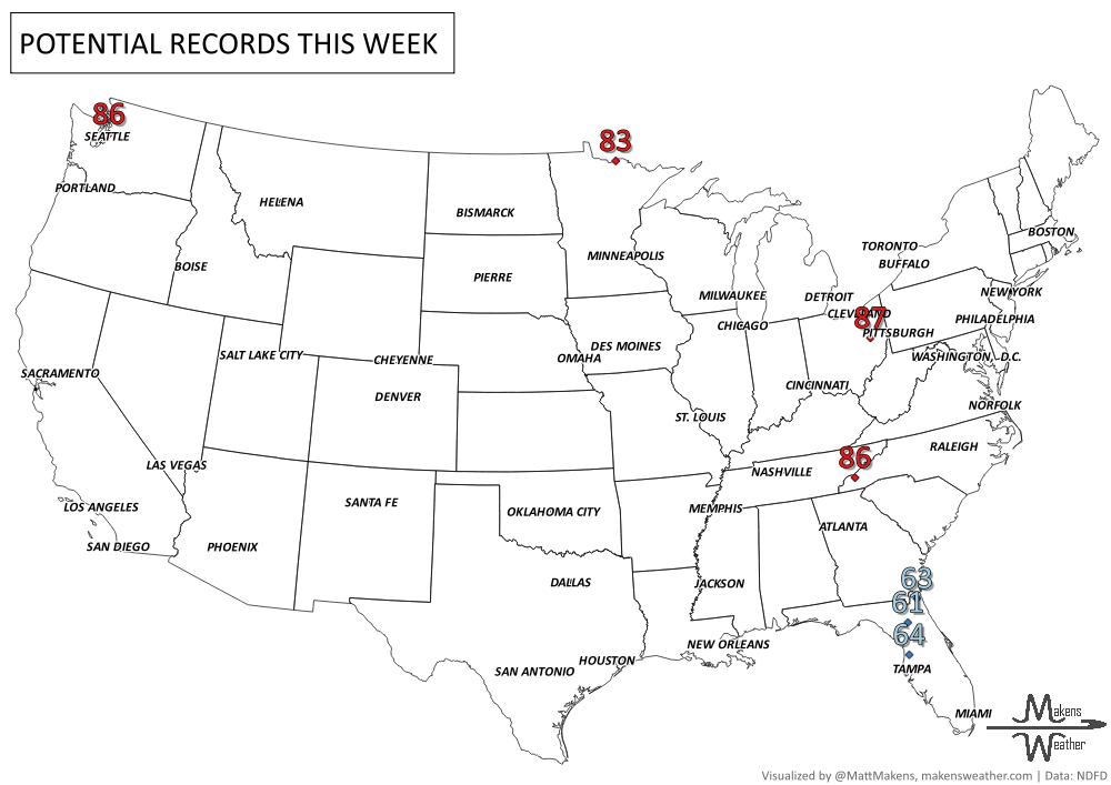 Great Lakes and Northeast: Staying unseasonably warm, especially Midwest and Mississippi Valley, where highs may approach daily records.