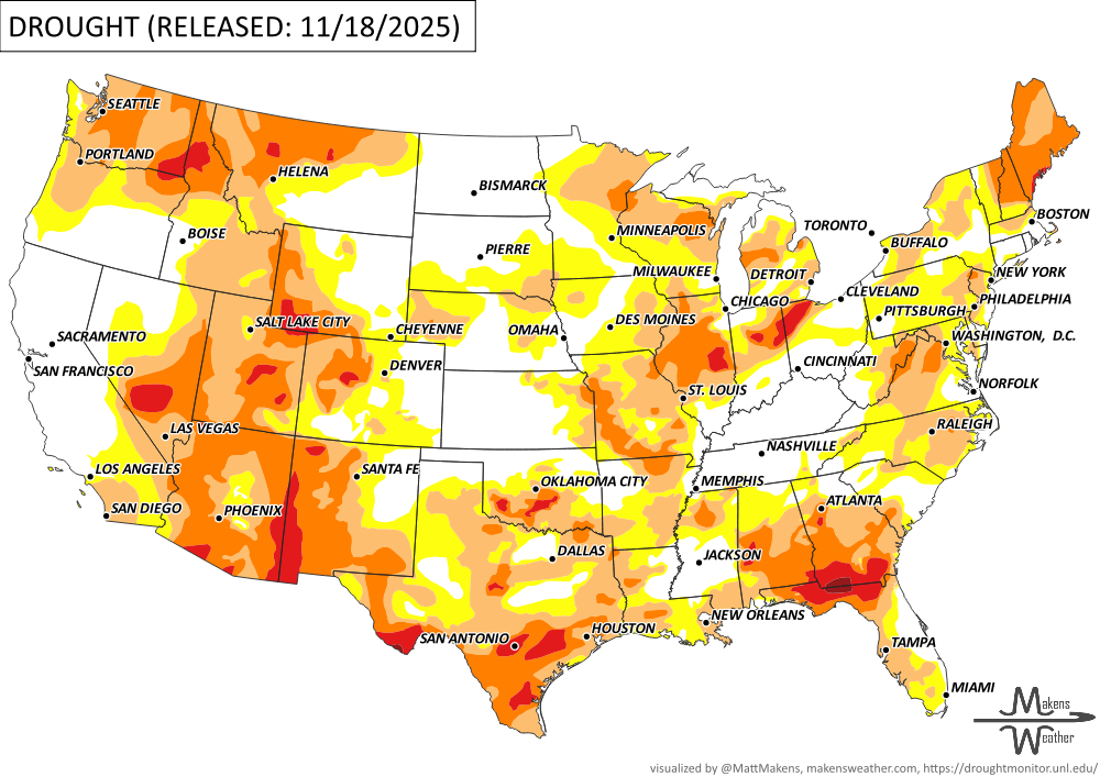 Drought conditions worsened across much of the central and eastern U.S. this week due to continued dry weather, with notable degradations in Oklahoma, Texas, Louisiana, Florida, Georgia, and parts of the Great Lakes. Meanwhile, wetter conditions brought much-needed drought relief to California, Washington, and the Northeast, where rain and snow helped improve soil moisture and streamflow. In the West, widespread precipitation also benefited southern Nevada, the Sierra Nevada, and coastal California. Despite the improvements, short-term dryness is intensifying in parts of the central Plains and Montana, while Puerto Rico and Hawaii saw mixed changes based on localized rainfall. -U.S. Department of Agriculture