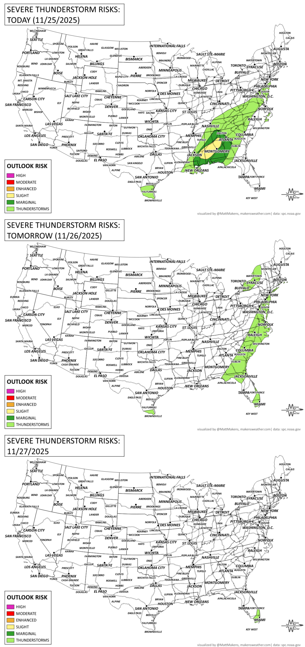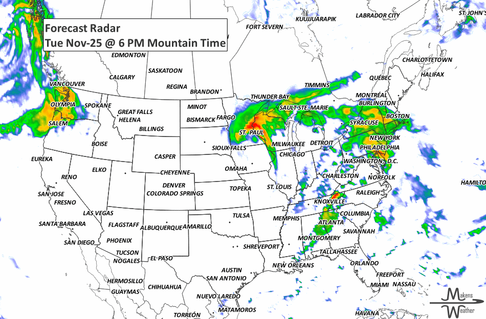 Tuesday (Nov 25): Rain changes to heavy snow across the northern Plains and Upper Midwest, with strong winds. Severe storms move across the Deep South.