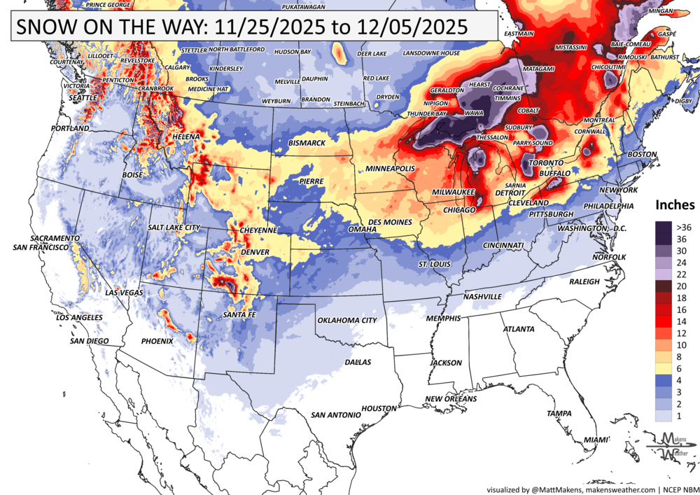Weekend (Nov 29–30): Heavy lake-effect snow continues in Michigan and upstate New York. A new storm brings snow to the High Plains, Central Rockies, and possibly into the Midwest.