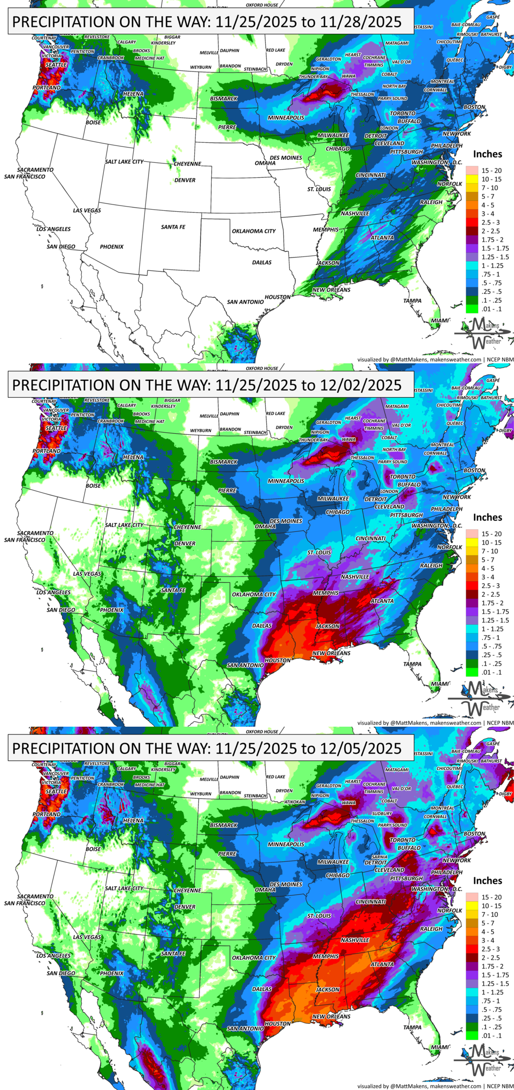 Thursday (Nov 27, Thanksgiving Day): Snow continues around the Great Lakes and Quebec. A strong cold front sweeps east with windy, colder conditions.