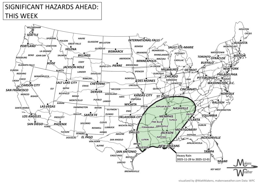 Early Next Week (Dec 1–2): More Gulf moisture triggers heavy rain and thunderstorms across the Lower Mississippi Valley. Arctic air deepens in the Northern Plains with subzero temps possible.