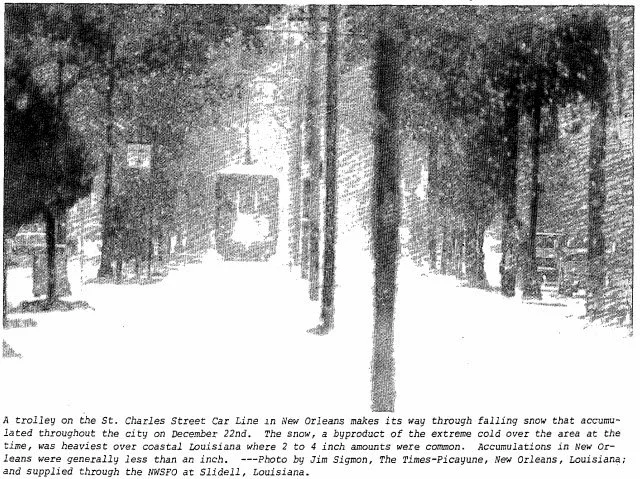 1989: The most significant cold spell of the century for the Deep South occurred from the 22 to the 26. New Orleans experienced 64 consecutive hours at or below 32 degrees Fahrenheit and a total of 81 out of 82 hours below freezing. A total of 15 hours was below 15 degrees with the lowest reading of 11 degrees on the morning of the 23rd. A low temperature of 8 degrees was recorded at Baton Rouge. Snow and sleet paralyzed transportation systems where as much as two to four inches of snow accumulated in Lafourche and Terrebonne Parishes. Snow and ice-covered the ground in New Orleans. The most significant impact was the breaking of water pipes in homes and businesses. Over 100 fires resulted in the New Orleans area within 24 hours due to a loss of water pressure and improperly utilized heating sources. Ice formed over shallow lakes and waterways where commercial fishing took heavy losses. Five weather-related deaths occurred in the service area during this rare Arctic outbreak.