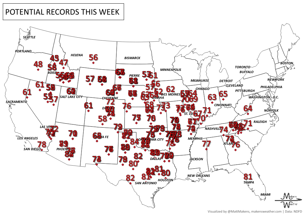 Warmer-than-normal temperatures spread across the Plains, South, and East.