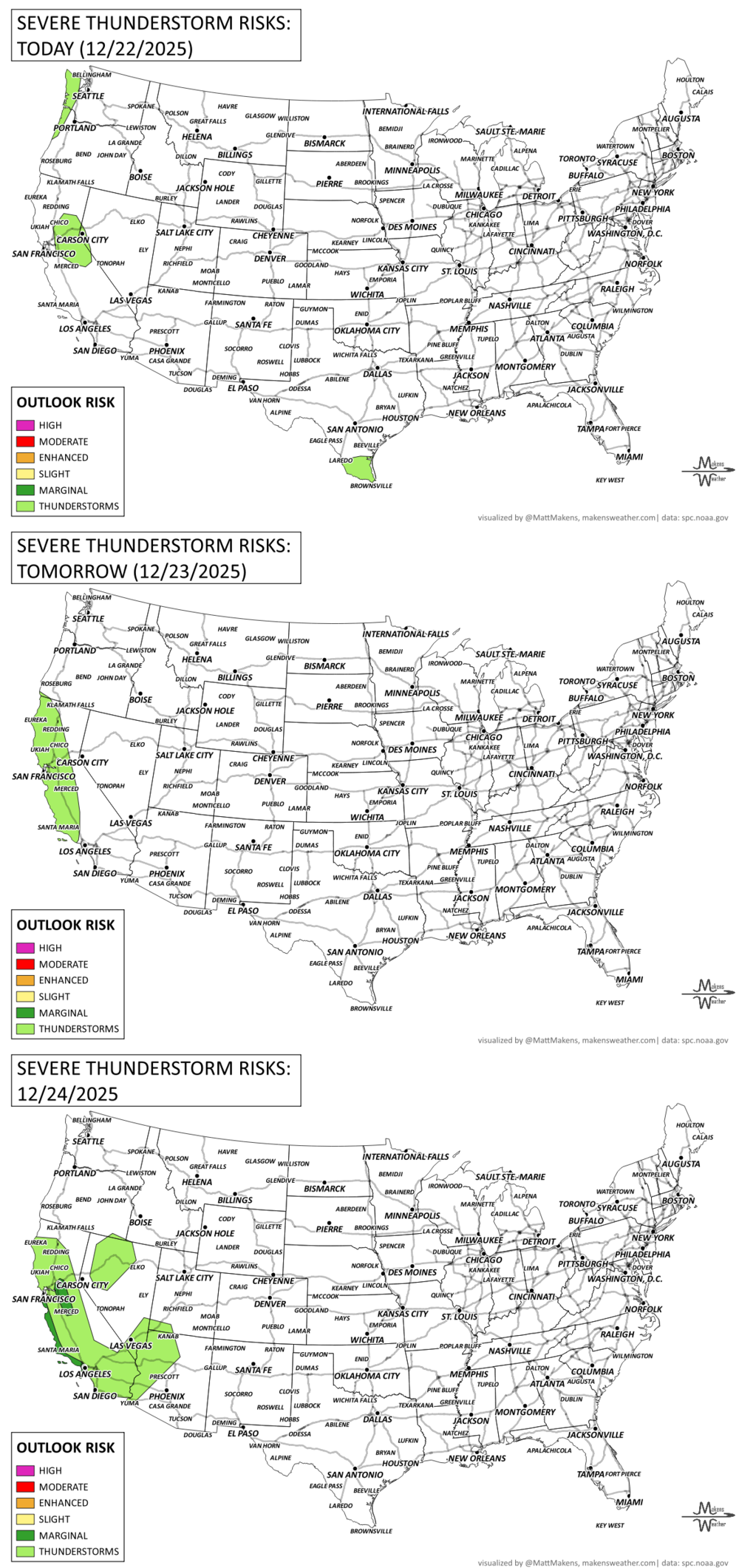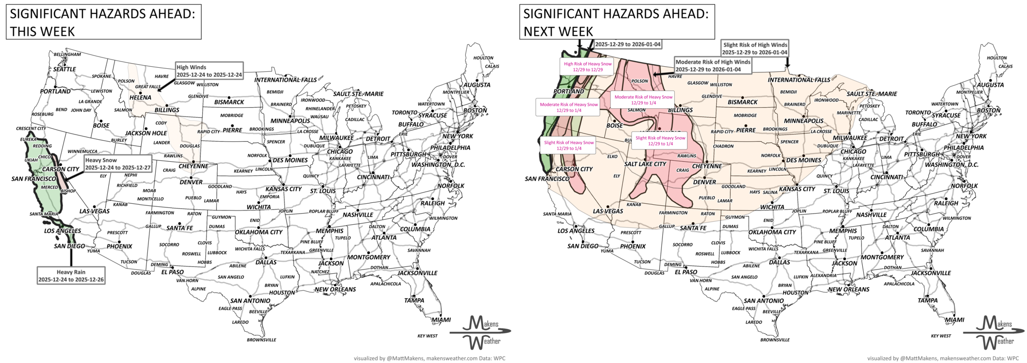 A powerful holiday-week storm pattern will bring impactful weather to several parts of the U.S. through the weekend. California will see another round of atmospheric river-fueled rain, with significant flooding in lower elevations and several feet of snow in the Sierra Nevada. Meanwhile, wintry precipitation could complicate travel across the Great Lakes, Mid-Atlantic, and New England, while the central Plains and parts of the South experience unseasonable warmth and fire weather conditions. Ongoing cold for much of Western and Central Canada, particularly Alberta.
