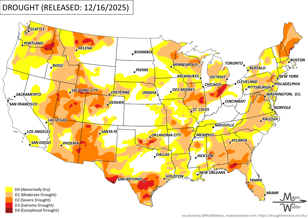 This week’s weather brought some drought relief to the Pacific Northwest and northern Rockies thanks to multiple Pacific storms, though mountain snowpack is still below normal for mid-December. Meanwhile, much of the Midwest, Southern Plains, Ohio Valley, and parts of the East missed out on meaningful precipitation, leading to worsening drought in those areas. -U.S. Department of Agriculture