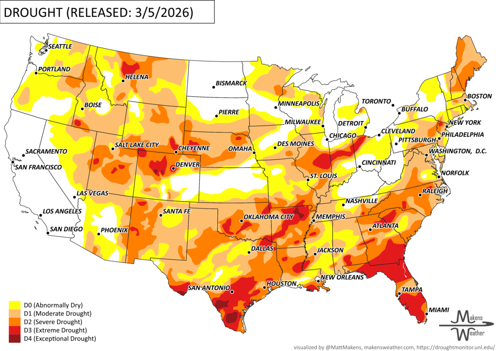Conditions have also worsened across the Midwest, with drought expanding west into the Central Great Plains and parts of the Rockies after a very dry winter. In the Western U.S., below-normal snowpack remains a major concern heading into spring.