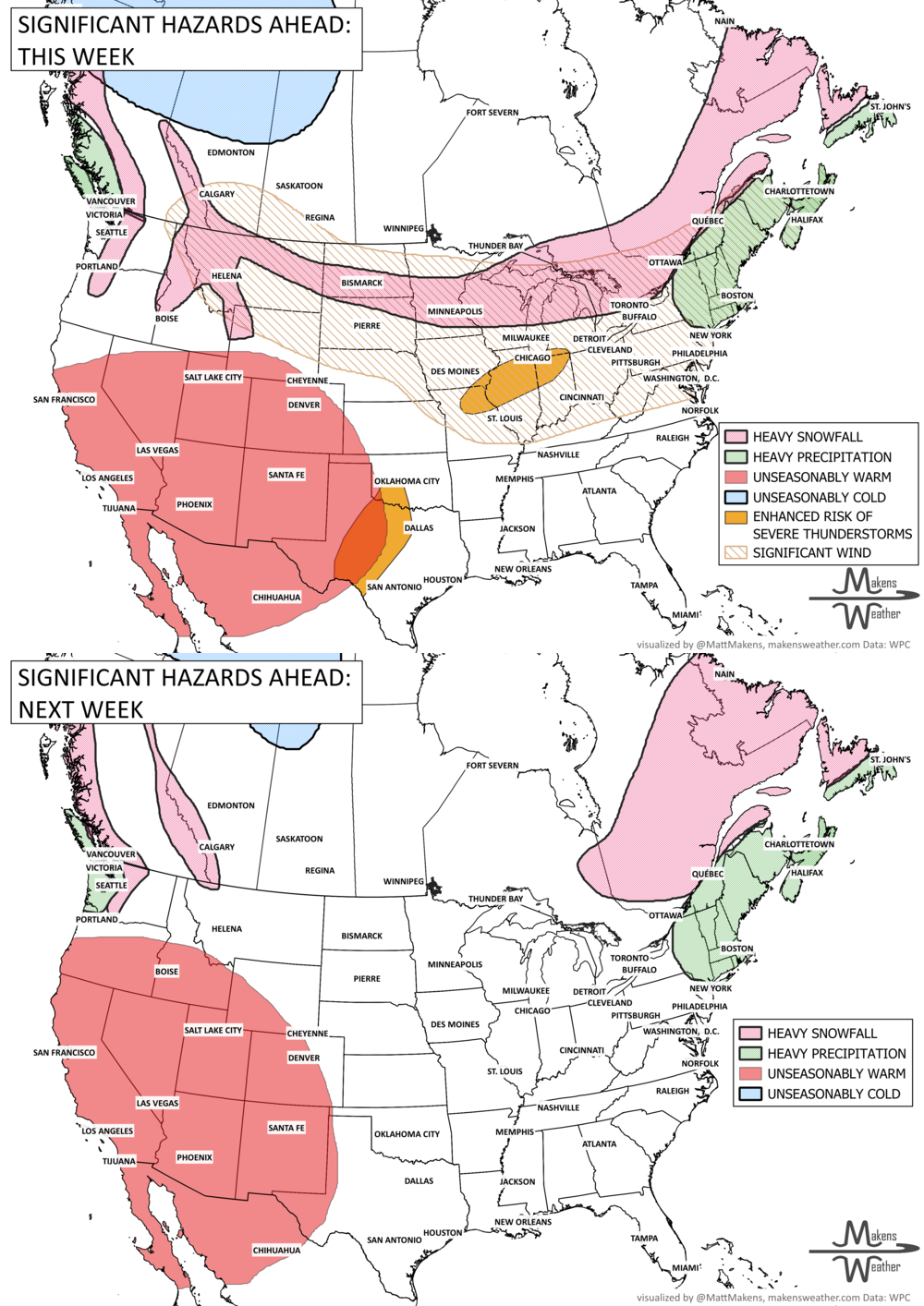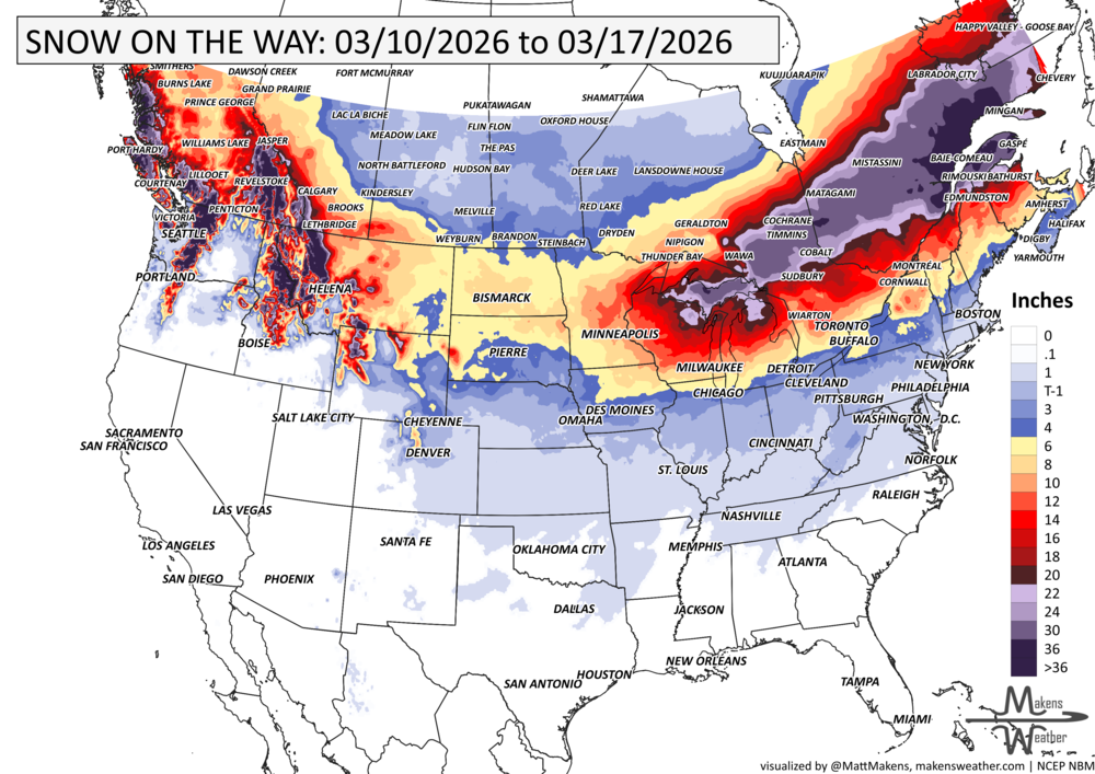 An active weather pattern is unfolding across much of the United States and Canada this week. Severe thunderstorms and flooding rains will develop from the Plains into the Midwest, while late-season snow and icy conditions affect parts of the Upper Midwest, Great Lakes, northern New England, and eastern Canada. Meanwhile, the Pacific Northwest faces heavy rain and mountain snow, including parts of BC and AB, and unusually warm spring temperatures continue across much of the East and Southwest.
