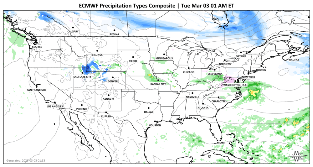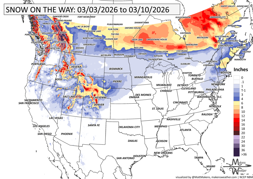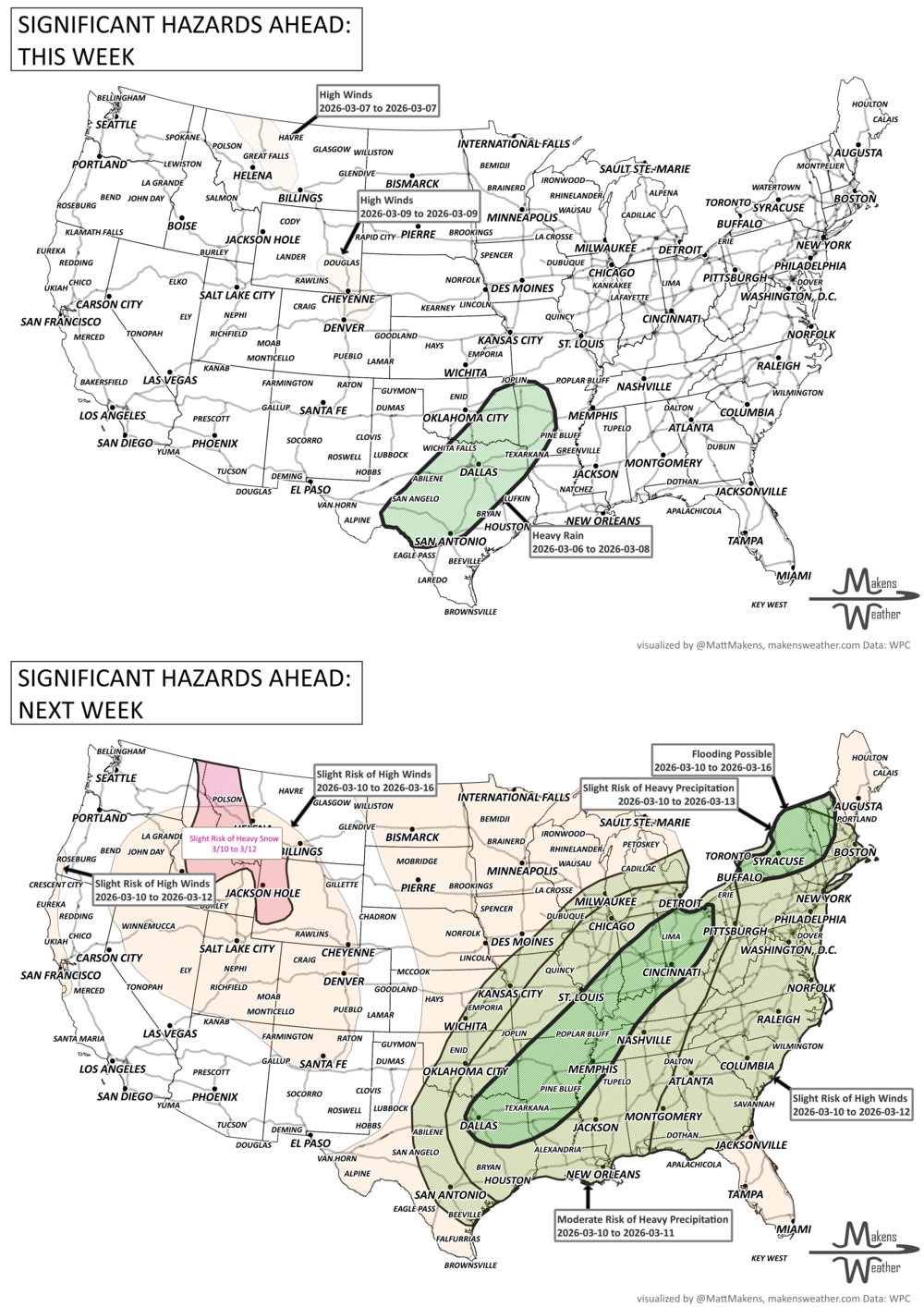 An active early-March pattern will bring slick travel to parts of the Northeast, rounds of strong to severe storms from the southern Plains to the Midwest, and a growing flood threat across the south-central U.S. late this week into the weekend. Meanwhile, much of the central and eastern U.S. turns unseasonably warm, with some areas flirting with daily records. A system crossing Canada will begin near Alberta and Saskatchewan with some moisture, but drop significant precipitation totals on Quebec and the Maritimes later this week. Moments of significant wind (chinook) will hit those along and east of the Rockies.