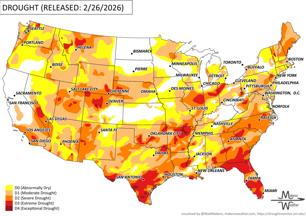Meanwhile, multiple storms impacted the eastern U.S., ending with a powerful late-winter blizzard on February 22–23 that dropped over a foot of snow from Philadelphia to Boston and nearly 38 inches in Providence, Rhode Island. Just days earlier, an early-season severe weather outbreak produced up to a dozen tornadoes in Illinois and Indiana.