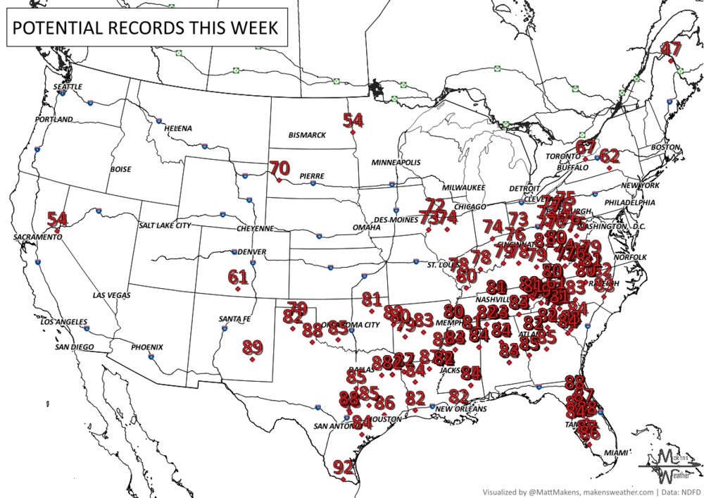 Record-challenging warmth expands from the southern Plains into the Southeast and toward the Ohio Valley and Mid-Atlantic.